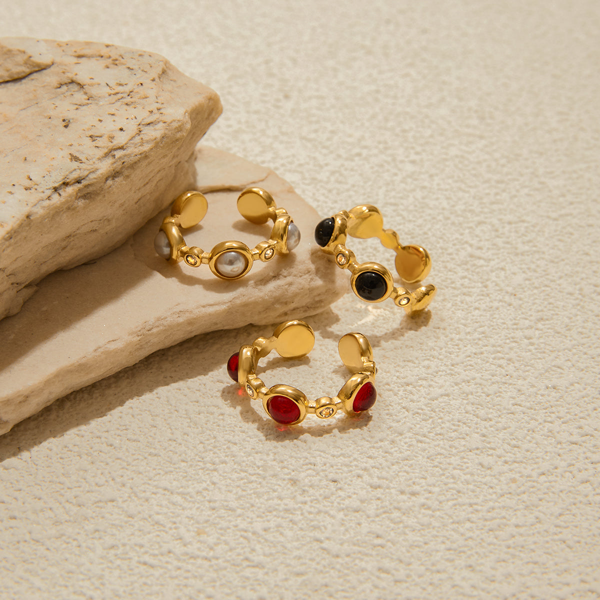 Made from premium stainless steel plated in 18K gold, it features an open band combining heart and round shapes, adorned with vibrant rhinestones that sparkle in every hue.