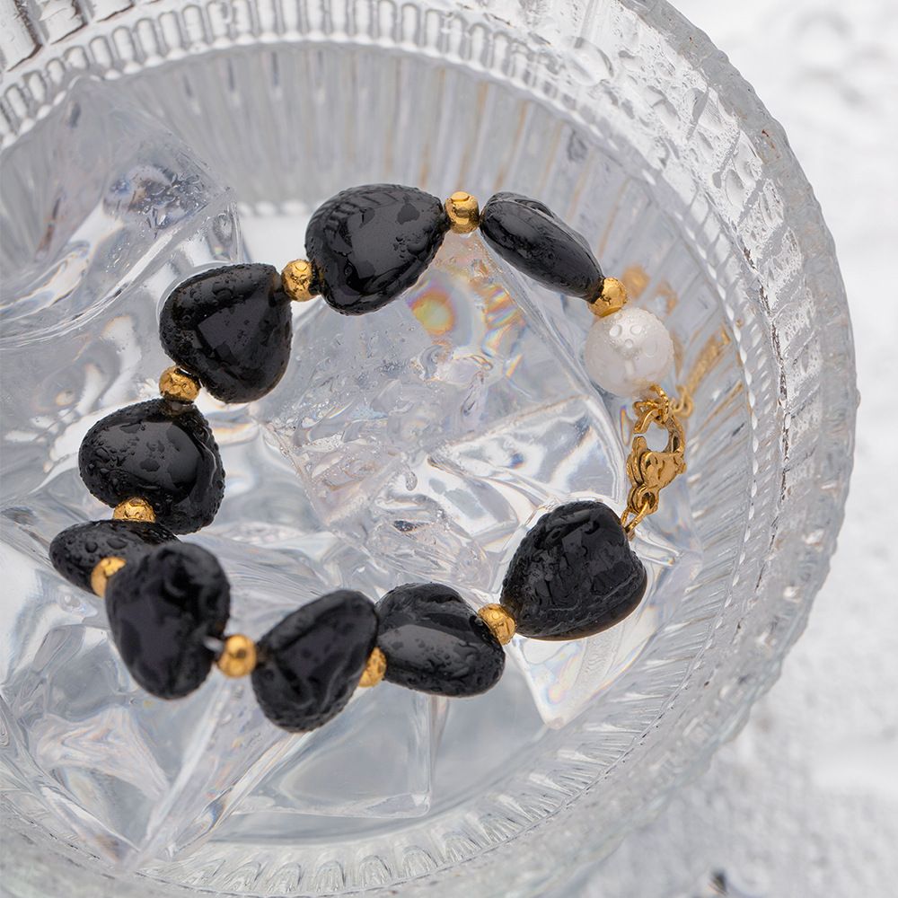 Noira by Saga & Segust embodies the beauty of contrast — a golden glow surrounding a heart of deep black agate. Crafted from stainless steel and plated with 18K gold, this elegant bracelet features a polished heart-shaped stone that symbolizes love, strength, and inner calm. Refined yet emotive, Noira is designed for women who embrace both passion and poise. Waterproof, hypoallergenic, and tarnish-resistant, it’s a timeless piece of modern romance and quiet power.