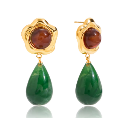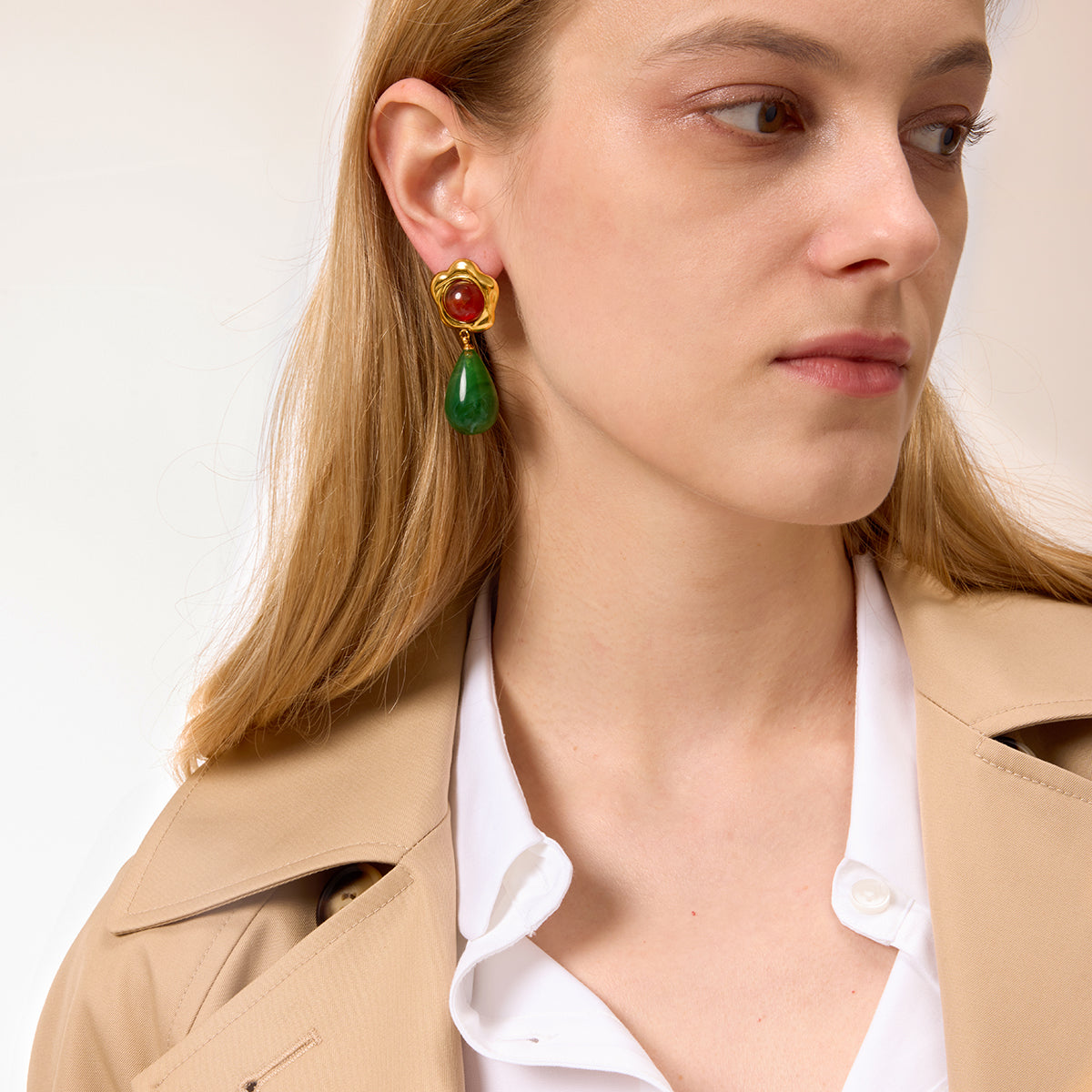 Rosaira by Saga & Segust blooms in radiant color and golden light. Crafted from stainless steel with fine 18K PVD gold plating, these elegant drop earrings feature a five-petal floral design adorned with rich red agate and luminous resin. A tribute to love and vitality, Rosaira combines the warmth of natural stone with the refinement of contemporary craftsmanship. Waterproof, hypoallergenic, and tarnish-resistant, it’s a perfect statement of passion and poise.