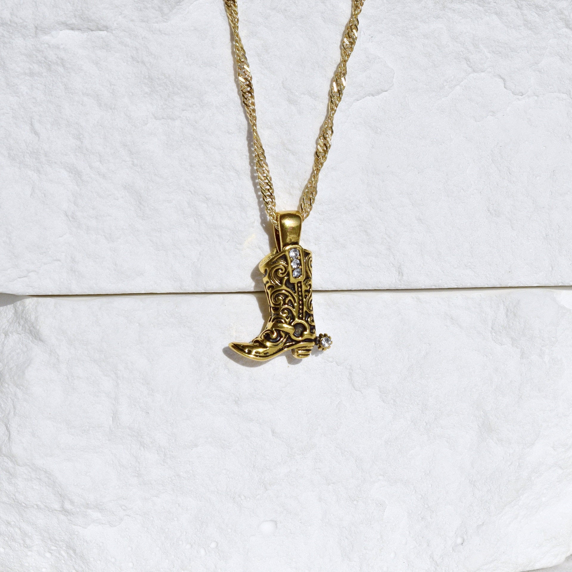 Wild Sol by Saga & Segust embodies the fearless charm of freedom and individuality. Crafted from durable stainless steel and finished with a rich 18K PVD gold plating, this necklace features a vintage-inspired cowboy boot pendant — a bold symbol of adventure and self-expression. Waterproof, tarnish-resistant, and effortlessly stylish, Wild Sol merges Western nostalgia with contemporary luxury. Perfect for layering or wearing solo, it’s a statement of confidence for the modern spirit.